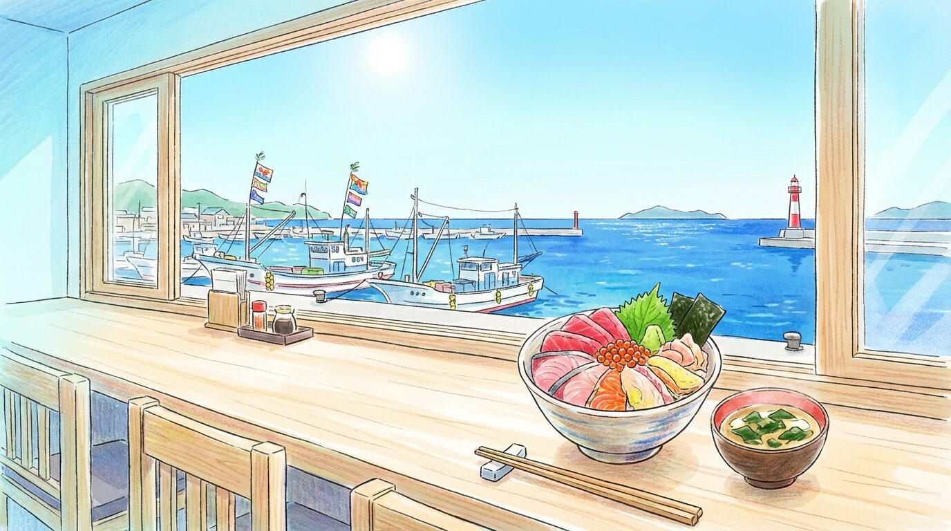 旅の途中、おーばんまい食堂で海鮮丼を食べる。海を眺めながら、新鮮な魚を味わう。そして、「また来たいな」って思う。
