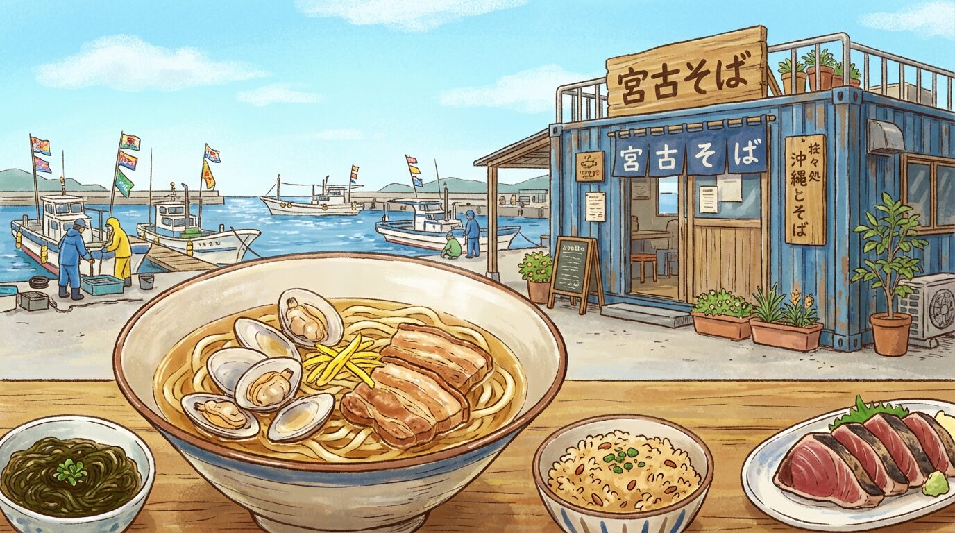 この記事では、港食堂ニュー浜やの魅力について、実際に何度も通った経験をもとに詳しく紹介していく。アサリ宮古そば、カツオのタタキ、マグロの漁師造り、全部書いていくので、伊良部島に行く予定がある人は絶対に港食堂ニュー浜やに立ち寄ってほしい。アサリ出汁の宮古そばを食べて、伊良部島の新しい味に出会う最高の時間を過ごせるはずだ。