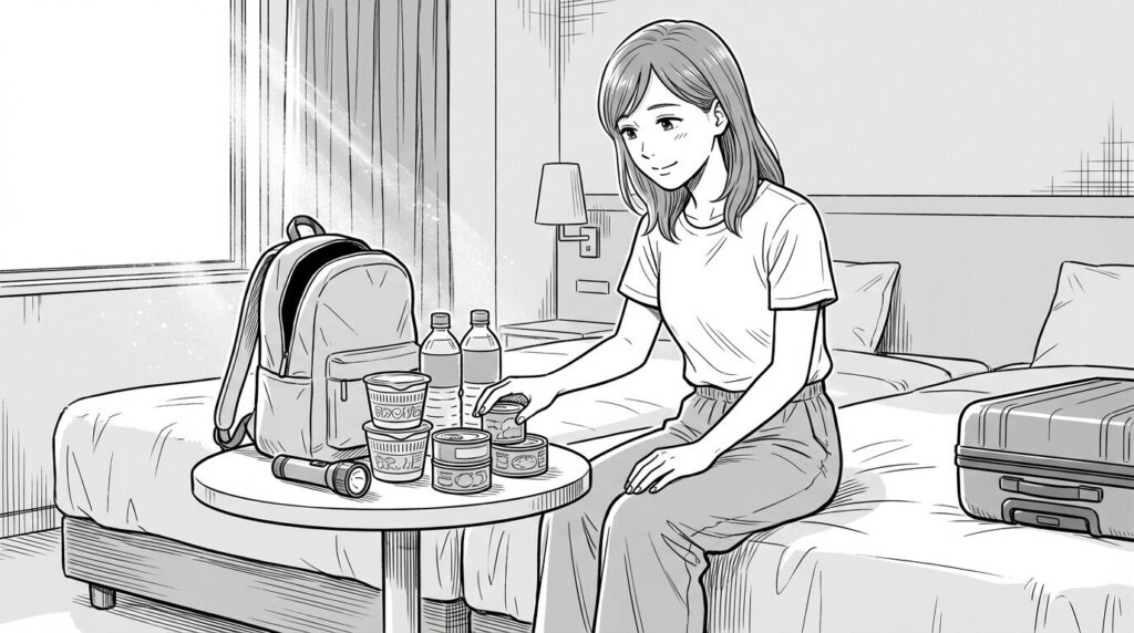 食料も同じで、カップ麺、パン、お菓子など、調理しなくても食べられるものを用意しておく。ホテルに滞在している場合は食事の提供があるけど、念のため自分でも食料を持っておくと安心だ。