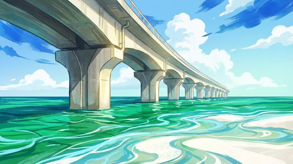 橋の真下から見上げる景色は、橋の上から見る景色とはまた違った感動があって、橋の構造や大きさを間近で感じられるのが面白い。全長3,540メートルもある橋が頭上にそびえ立っているという非日常的な光景は、他では絶対に見られない特別な体験だ。