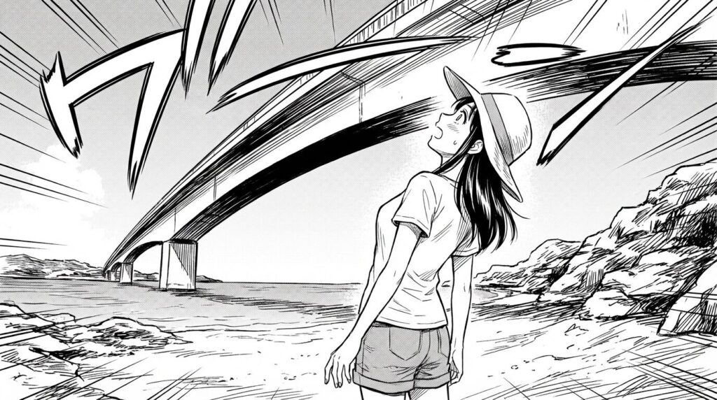 ビーチに出て顔を上げた瞬間、思わず息を呑んだ。頭上に伊良部大橋が圧倒的な存在感でそびえていて、全長3,540メートルもある橋を真下から見上げるという、普段では絶対に経験できない光景が広がっている。「すごい」って声が自然と出てきて、しばらくその場に立ち尽くしてしまった。