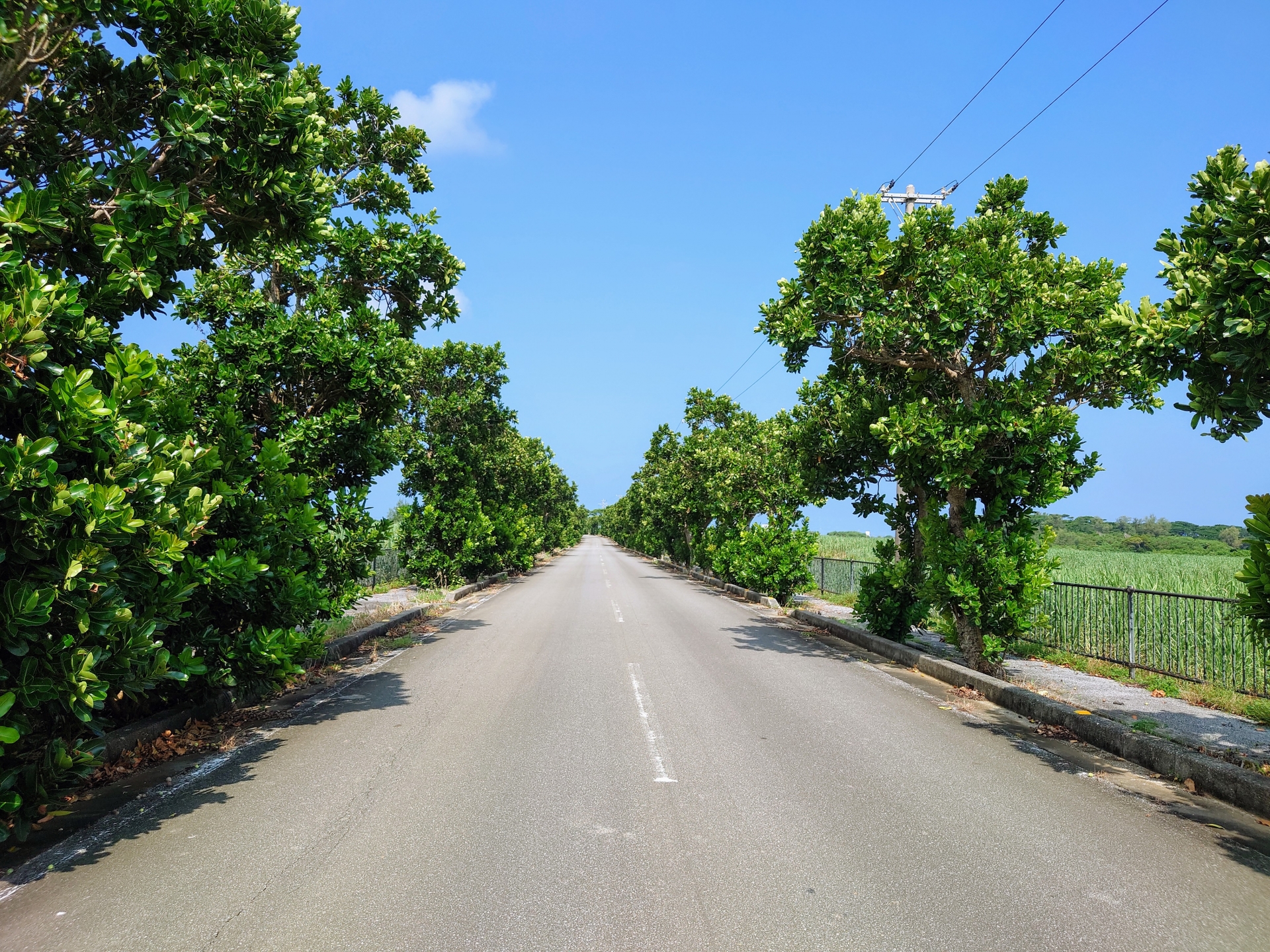 佐良浜から下地島空港に向かう途中で、なんだか妙に落ち着く道があって。両側に背の高い木が並んでいて、木漏れ日が道路に落ちて、風が葉を揺らす音が聞こえて。